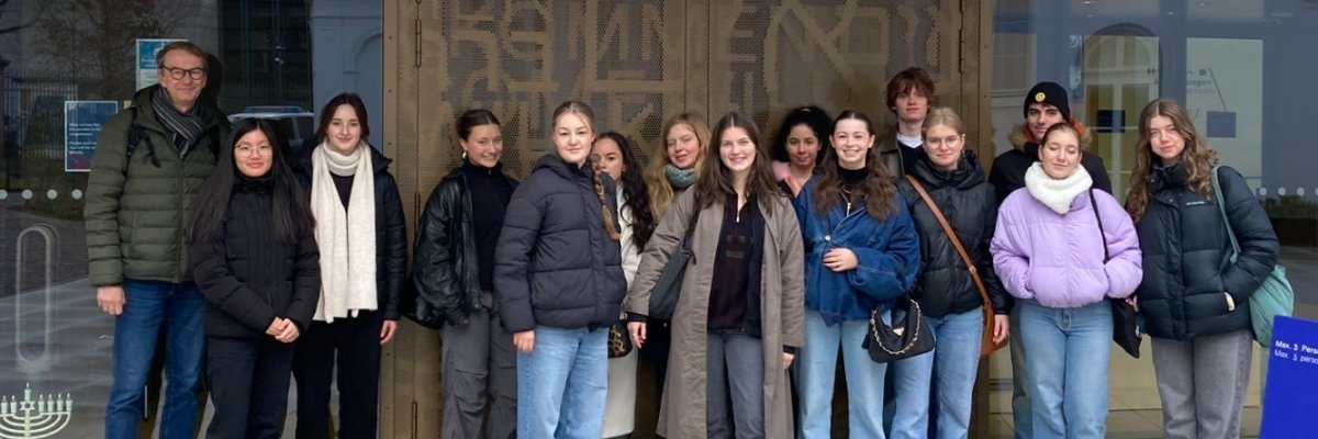 Unsere Gruppe startete um 9:02 Uhr mit der Deutschen Bahn nach Frankfurt. Tatsächlich startete der Zug auch pünktlich, allerdings stand er dann ca. 30 Minuten in Mainz aufgrund von Personen, die wohl auf den Zuggleisen den Verkehr blockierten. Nach der Ankunft in Frankfurt erreichten wir nach einem kurzen Fußweg das Jüdische Museum, das im Rothschild-Palais schon architektonisch sehr beeindruckte. Schon im Innenhof wurden wir konfrontiert mit der Schoah - eine Kunst-Installation von Ariel Schlesinger prägt den Vorplatz des neuen Jüdischen Museums. Die Skulptur besteht aus zwei in Aluminium gegossenen Bäumen, von denen einer im Boden verpflanzt ist. Der andere scheint sich kopfüber an den Ästen des unteren zu halten und streckt seine Wurzeln gegen den Himmel. Die Idee, einen Baum zweifach, gleich einer Spiegelung seiner Selbst, zu einem Wahrzeichen des Jüdischen Museums Frankfurt zu machen, zieht ihre Inspiration aus der Geschichte der Frankfurter Juden: dem Gefühl gleichzeitiger Verbundenheit und Entwurzelung. Zur Installation gehört eine Sprechkonserve, auf der durchgehend die Namen der jüdischen Opfer des NS-Terrors vorgelesen werden.