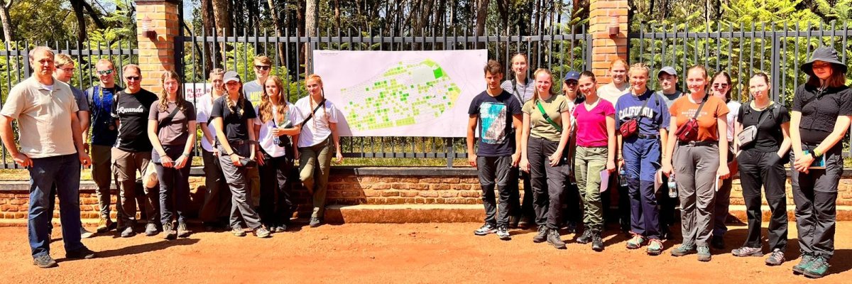 Auf dem Programm der Reisegruppe stand heute der Besuch beim Agroforstprojekt des ehemaligen Johnny-Schülers Prof. Sigmar Seidel (Universität Koblenz). Prof. Seidel war vor Ort und erläuterte das seit 1934 (!) bestehende Projekt, das insgesamt Versuchsflächen umfasst. Ruanda besitzt mit dem Nyungwe-Forest den größten Bergnebelwald Ostafrikas mit zahlreichen Arten, die weltweit nur in Ruanda oder am Zentralafrikanischen Graben vorkommen. Zugleich ist der Nutzungsdruck des extrem dicht besiedelten Landes sehr groß. Zur Kompensation der abnehmenden Flächenerträge wurde in der Vergangenheit wo immer möglich Neuland erschlossen. Die Erhaltung der Biodiversität und der geoökologischen Funktionen des Waldes (CO2-Senke, Wasserrückhalt und dezentraler Hochwasserschutz, Evapotranspiration und damit Aufrechterhaltung des für das Niederschlagsgeschehen im benachbarten Kulturland sehr bedeutenden kleinen Wasserkreislaufes) nach dem „Glasglockenprinzip“ ist unter diesen Rahmenbedingungen unmöglich; vielmehr erfordert diese eine nachhaltige Intensivierung der land- und forstwirtschaftlichen Produktion in den Randzonen. Im Rahmen des "Cyamudongo-Projektes" werden Bäuerinnen und Bauern inden Randzonen des Nationalparks für Methoden einer ökologisch nachhaltigen Landwirtschaft sensibilisiert und in Techniken der Agroforstwirtschaft geschult. Die Maßnahmen tragen zur Ernährungssicherheit bei und senken gleichzeitig den Nutzungsdruck auf den Regenwald.