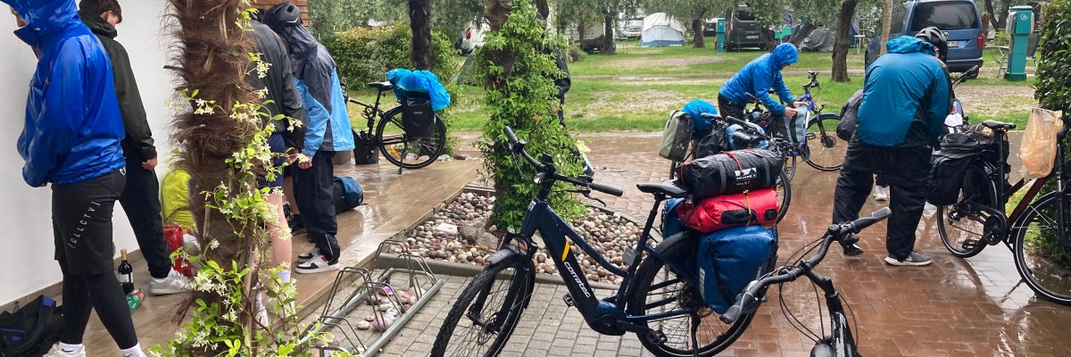 7:00 Uhr in Torbole: Es regnet in Strömen, der Blick aus dem Zelt ist gruselig und düster - die Motivation auf dem Tiefpunkt. In Windeseile wurden die Zelte abgebaut, die Taschen in Sicherheit gebracht und das romantische Frühstück am See fiel "ins Wasser". Zudem musste auch noch das schwere Gepäck (siehe gestriger Achsbruch des Hängers) unter allen brüderlich und schwesterlich geteilt werden. "So ein Sch....-Wetter!" - erklang mit vielstimmigem Gesang über den Zeltplatz.