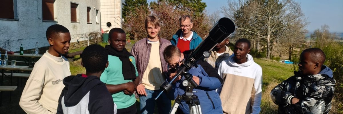 Heute morgen besuchten unsere ruandischen Gäste nochmals den Fachunterricht in verschiedenen Lerngruppen, bevor es zum gemeinsamen Mittagessen im Bistro ging. Vor der Abfahrt zur Schulsternwarte auf dem Hohen List in Schalkenmehren übergaben wir den SchülerInnen und Lehrkräften noch Smartphones, gesponsert von der Firma Nink. Die Freude hierüber war natürlich sehr groß, einige ruandische SchülerInnen hatten bis dato kein Handy und auch unser Gastlehrer Fulgence freute sich sehr darüber, ein ordentliches und funktionsfähiges Smartphone in den Händen zu halten. Mit insgesamt 5 Privat-PKW´s ging es dann los in die Eifel. Die Sternwarte ist wunderbar auf einem Hügel gelegen mit Blick ins Tal und die Weiten der Vulkaneifel - eine wahre Oase der Ruhe. Nach einem Spaziergang entlang des Schalkenmehrener Maares erfolgten dann die ersten Sonnenbeobachtungen. Die technische Verantwortung hat heute das Team der Astro-AG (Emma Förger, Gero Hanrath und Philipp Rompf) inne, da Herr Fisseni in Ludwigshafen beim Landesfinale Jugend forscht heute Abend den Preis für den JuFo-Lehrer 2025 in Rheinland-Pfalz entgegen nehmen wird. Am Abend kamen einige leckere Steaks, Würstchen und auch etwas Grillkäse auf den Grill zusammen mit dem schmackhaften Nudelsalat von Emma ein köstliches Abendessen - vielen Dank! Spontan führten Philipp und Gero die Gäste noch über das gesamte Gelände, bevor es dann dunkel wurde und die eigentliche Himmelsbeobachtung startete.