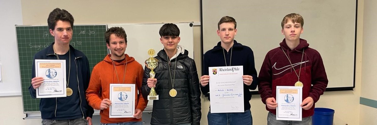 Im Landesfinale der Wettkampfklasse 1 gewann das Johnny-Team überlegen den Titel des Rheinland-Pfalz-Meisters. Unser Glückwunsch gilt den Spielern David Meuer, Johannes Plog, Christian Samtleben, Daniel Kunz und Leander Richter sowie ihrem AG-Leiter Johannes Bida.