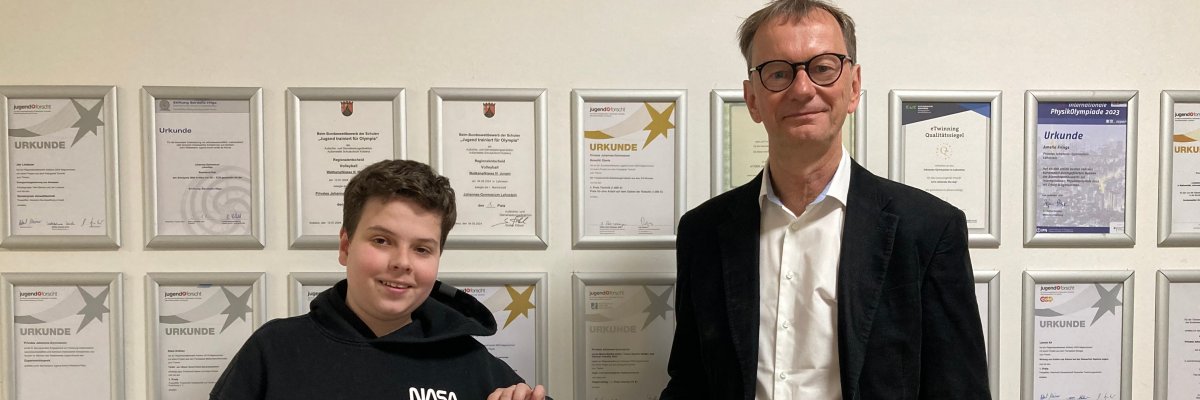 Am 12. April wurde Thorben dann beim Landeswettbewerb Mathematik zum Landessieger gekürt. Er hat die Jury mit seinen mathematischen Leistungen sehr beeindruckt und konnte diese im Rahmen eines 3-tägigen Workshops an der Universität Kaiserlautern unter Beweis stellen. Am 25. und 26.04.2024 nimmt nun Thorben Weinhold zusammen mit seinen Mitschülern Enjo Westphal und Gero Hanrath am Landesfinale Schüler experimentieren mit ihrer Forschungsarbeit zur Balkonaufzuchtstation in der Sparte Biologie teil. „Wir drücken den drei Jungs die Daumen für das Landesfinale – die Leistungen von Thorben Weinhold sind schon mehr als außergewöhnlich“, so der stolze Schulleiter Rudolf Loch.