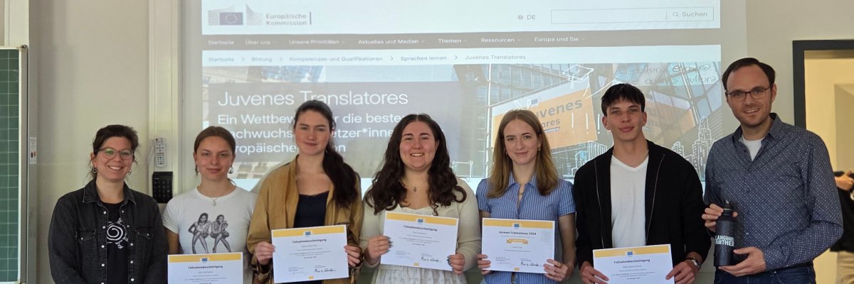 Mit großer Freude überreichte die Fachschaft Englisch am Mittwoch, dem 30.04.2025, in einer kleinen Feierstunde an Jette Spürkmann, Emma Eick, Daria Jaufmann, Leona Groß und Julian Schwab Urkunden, denn alle hatten mit großem Erfolg am Wettbewerb "Juvenes Translatores" der EU teilgenommen.