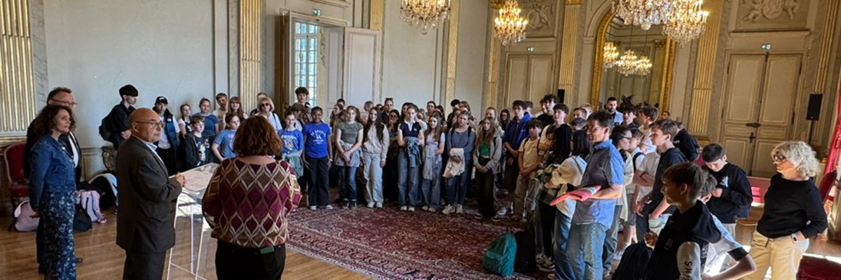 Am Nachmittag wurde die gesamte Gruppe anlässlich des 70-jährigen Bestehens unseres Austauschs im Rathaus empfangen: deutsche und französische Teilnehmerinnen und Teilnehmer, begleitende Lehrerinnen und Lehrer sowie die Schulleiterin des Collège, Mme Cartier und der Schulleiter des Lycée, M. Persent. Im Festsaal aus dem Jahr 1777 ging Bürgermeisterassistent Gérard Lebas in seiner Würdigung auf die deutsch-französische Geschichte, auf die Bedeutung des Fremdsprachenlernens und den Wert des Austauschs ein. Lebendig wurde sein Vortrag auch durch die Schilderung eigener Erfahrungen, an denen er die Anwesenden Teil haben ließ. Gestärkt mit einem (alkoholfreien) „vin d’honneur“ ging es anschließend ins Wochenende, an dem die Gastfamilien individuelle Programme gestalteten.