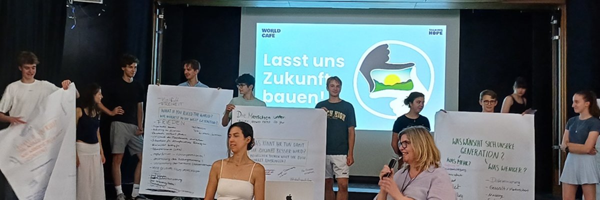 Diesen Worten schloss sich die Gastrednerin des Tages, Frau Eva-Maria McCormack, in ihrem einleitenden Kurzvortrag an, indem sie darauf hinwies, dass Hoffnung auch immer mit Angst einhergeht. Diese Angst, so die Gründerin und Geschäftsführerin der gemeinnützigen Organisation „Talking Hope“, die sich für nachhaltige Lebensbedingungen, soziale Gerechtigkeit, Gesundheit und die aktive demokratische Teilhabe aller Gesellschaftsgruppen engagiert, rührt zum einen daher, dass unsere Demokratie unter Druck steht und Ungleichheit in unserer Gesellschaft grassiert. Zum anderen überholt Künstliche Intelligenz unsere menschlichen Möglichkeiten. Und alles umspannend, gefährdet die Klimakrise unsere Lebensbedingungen. Folglich sind neues Denken und neue Lösungen gefragt. In Kleingruppen entwickelten die SchülerInnen der MSS 11 und MSS 12 Ideen, wie eine hoffnungsfrohe Zukunft gestaltet werden kann. Darüber hinaus konnten sich die SchülerInnen über ihre Ideen für ein gelingendes Leben austauschen und im Rahmen eines World-Cafés präsentieren.