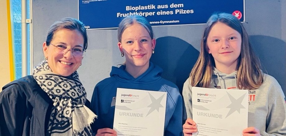 Nike Hanrath und Mila Dopichai (6c) | Bioplastik aus dem Fruchtkörper eines Pilzes | 1. Platz Biologie Jugend forscht Junior, Regionalwettbewerb Remagen |