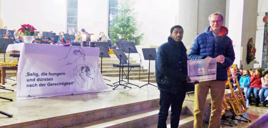 Im Rahmen des traditionellen Weihnachtskonzerts des privaten Johannes-Gymnasiums in Lahnstein übergab Herr Rudolf Loch, der Schulleiter der Einrichtung, einen Scheck über beeindruckende 31.017,33 € an Herrn Protogene Niyigena, einen Vertreter der beiden ruandischen Partnerschulen des Johannes-Gymnasiums.
