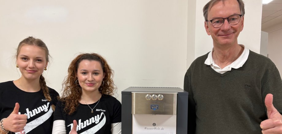 Eine langjährige Forderung der Schülerschaft nach einem Wasserspender im Neubau ist nun endlich in Erfüllung gegangen. Mit finanzieller Unterstützung der SV konnte nun ein Wasserspender im EG des Altbaus installiert werden. Er wandelt Leitungswasser in frisches Trinkwasser um und steht nun allen in der Schulgemeinschaft zur Verfügung. Darüber freuen sich mit Schulleiter Rudolf Loch auch die beiden Schülersprecherinnen Marleen Steffens und Sophie Knipper.