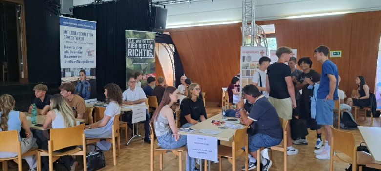 Das Spektrum war breit gefächert und reichte von Medizin, Psychologie, Jura, Management, Banking, IT und Cyber Security bis hin zur Bundeswehr, dem Justizvollzugsdienst, der Musikhochschule sowie dem Berufsfeld der Architektur. Viele der Ehemaligen hatten ihre Stände mit Roll-Ups, Flyern, Anschauungsmaterial und kleinen Give-Aways ansprechend gestaltet und ermöglichten den Schülerinnen und Schülern so einen offenen, informativen Austausch auf Augenhöhe.