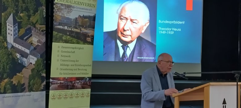 7.5.2025 - Eine Sternstunde an einem Mittwochabend im Johannes-Gymnasium und eine Bereicherung für die Aktion "Ehemalige für unser Johnny": Der bekannte Journalist, Publizist und Bestseller-Autor Dr. Heribert Schwan (Abitur 1966 am Johannes-Gymnasium) stellte sein neues Buch >"Heuss weiß es und billigt es" Die erstaunliche Geschichte der Bundespräsidenten und ihrer Ausspähung durch die DDR-Staatssicherheit< vor und berichtete über seine als Historiker gesammelten Erkenntnisse aus den Stasi-Akten zu allen Bundespräsidenten aus der Zeit des geteilten Deutschlands von Theodor Heuss bis Richard von Weizsäcker.