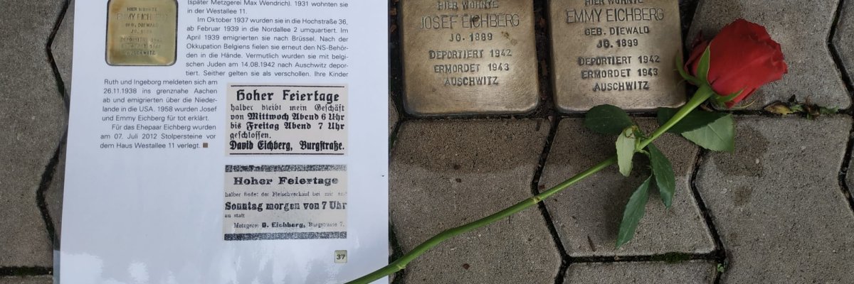 Ausgehend von der Projektwoche zum Thema Judentum 2023 hat die Fachschaft Geschichte beschlossen, dass jedes Jahr der Leistungskurs Geschichte im Umfeld des 9. Novembers in Gedenken an die Reichspogromnacht die Stolpersteine, die in Lahnstein zu finden sind, säubert, eine Rose hinterlegt und ein Informationsblatt zu der Person, an die der Stolperstein erinnert.